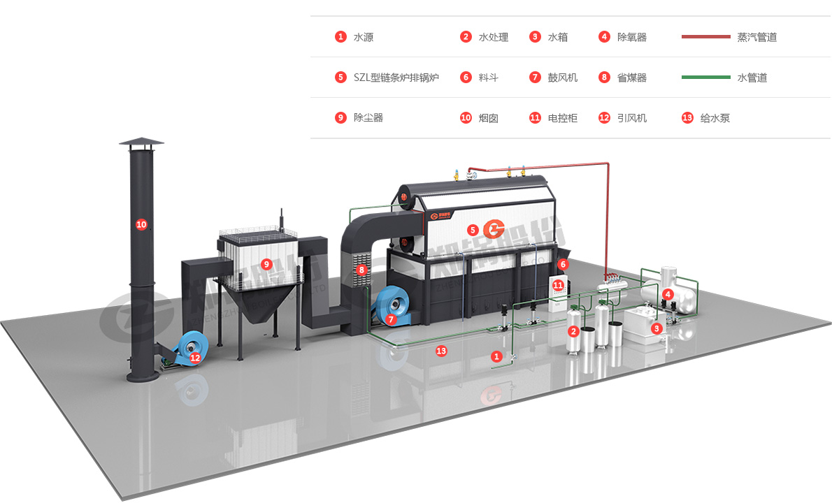 | 燃料供应系统 | 上煤机、皮带输煤机、破碎机、振动筛电子皮带秤、电磁除铁器、双梨式卸料器、炉前给煤机等 |