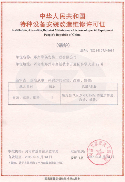 锅炉装置革新维修许可证