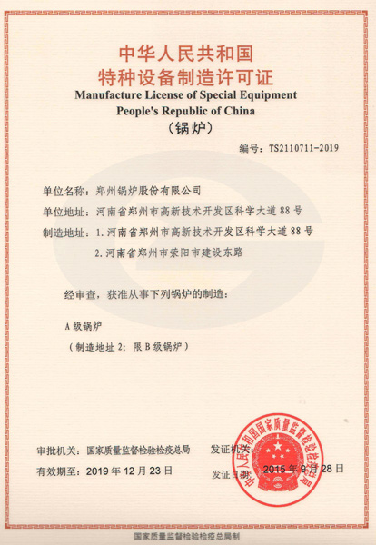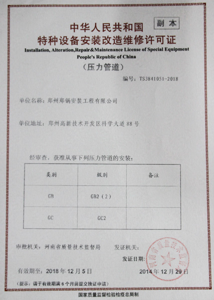 公司拥有A级锅炉制造许可证,1级锅炉装置革新维修许可证,压力管道装置革新维修许可证,计量及格确认证书等,是世界银行GEF高效环保锅炉项目生产基地。